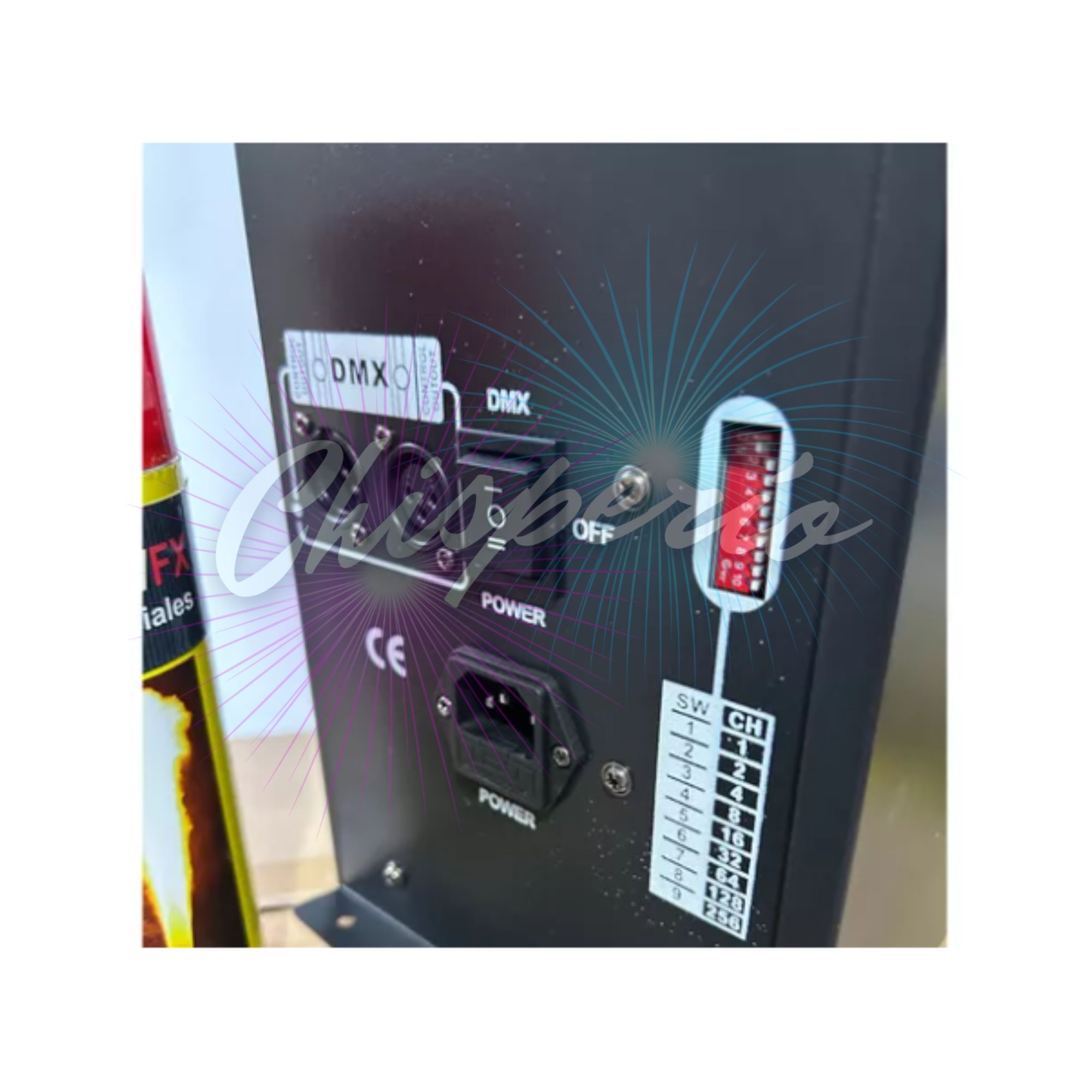 Entradas de energía y conectores de control DMX, que permiten integrarla con sistemas de iluminación y efectos en shows profesionales.