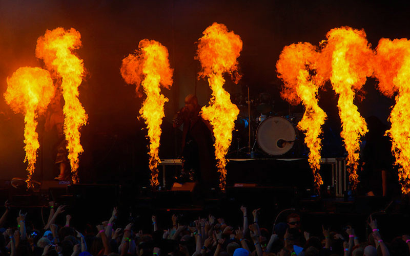 Mediante pulsos eléctricos controlados, se libera el gas y se enciende creando columnas de fuego controladas de hasta varios metros de altura.