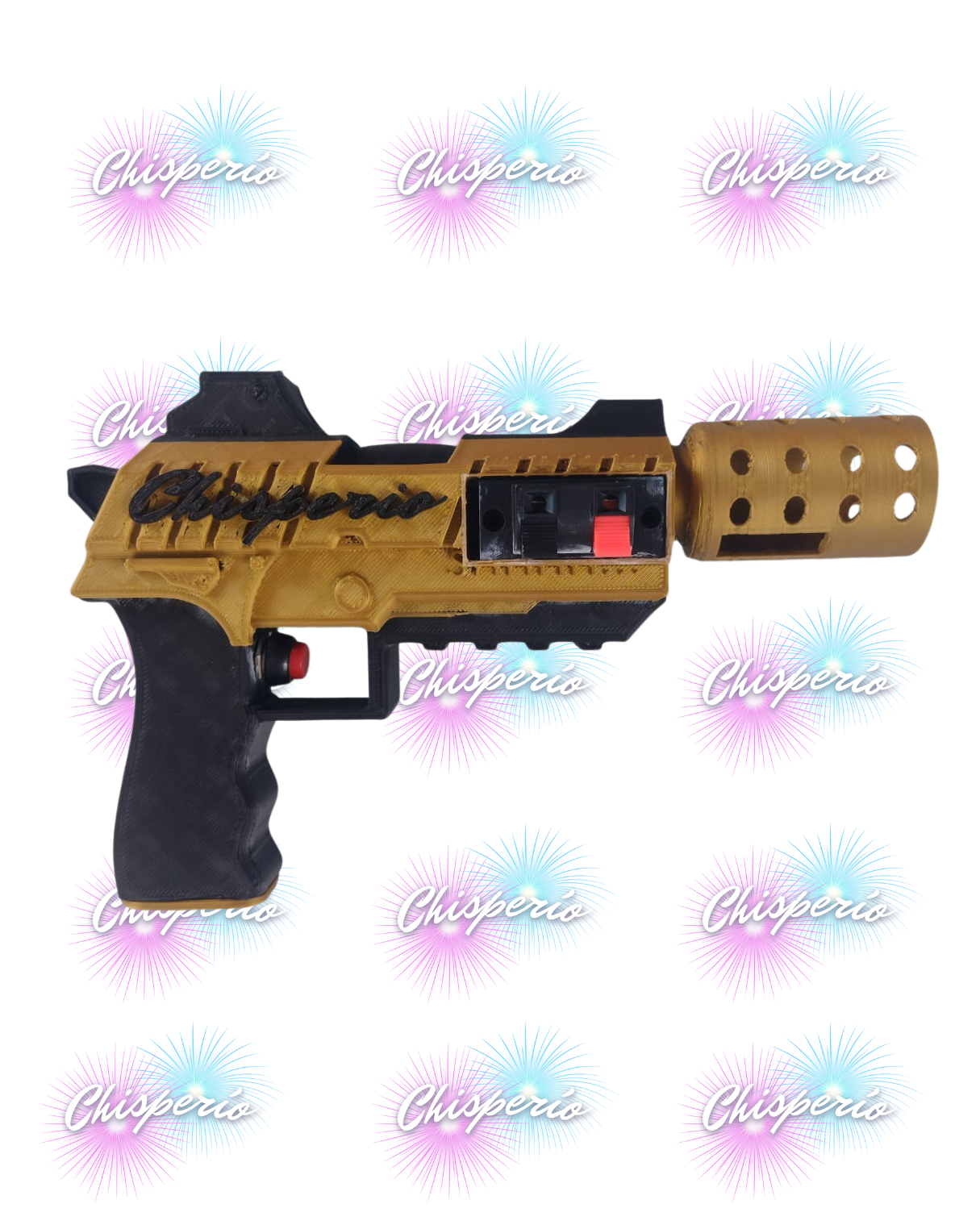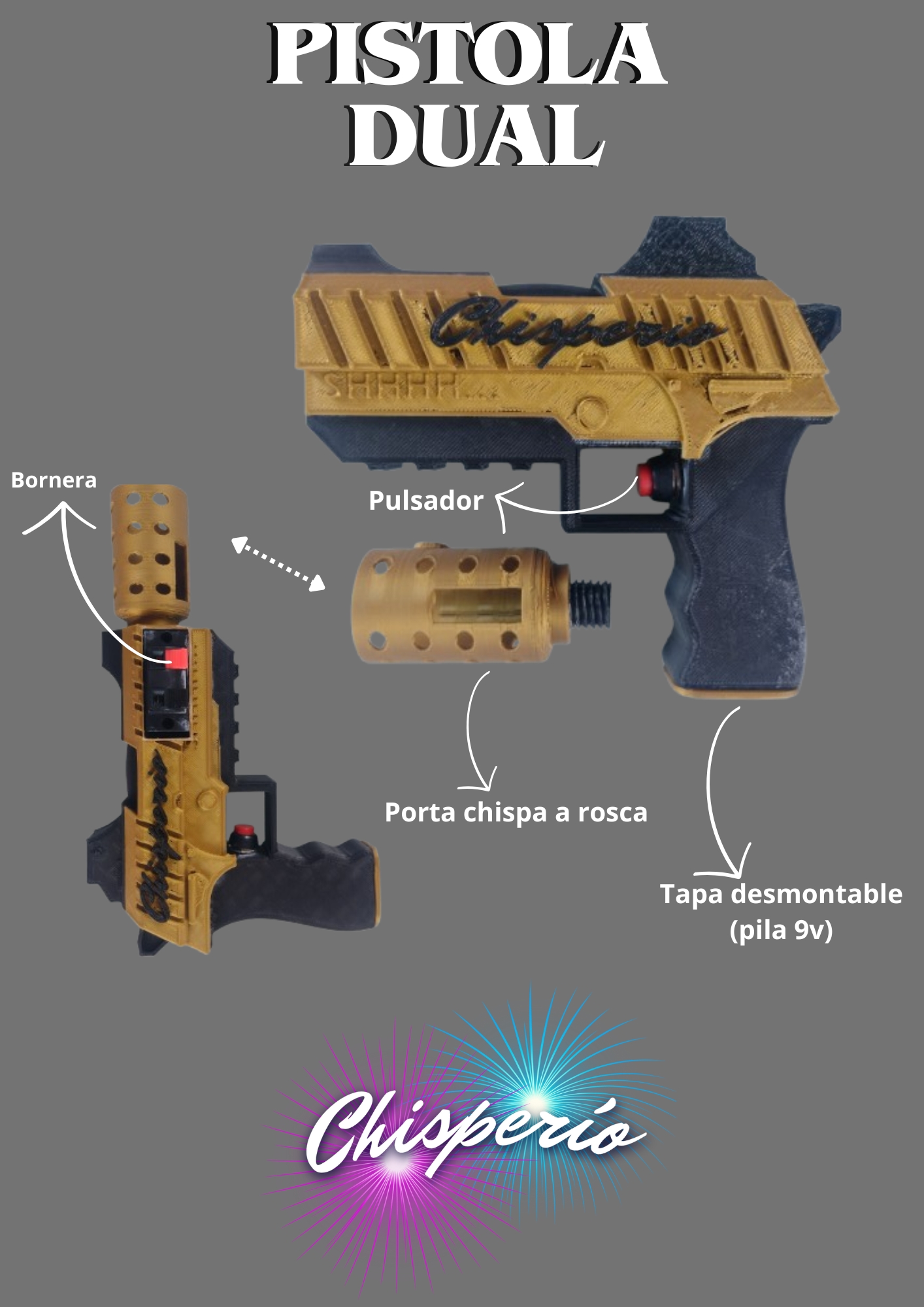 La Pistola Dual de Chisperío es la fusión perfecta entre diseño innovador y funcionalidad profesional. Con su impactante combinación de colores dorado y negro, esta herramienta no solo garantiza un encendido eléctrico eficaz, sino que también destaca visualmente en cualquier evento o show pirotécnico.